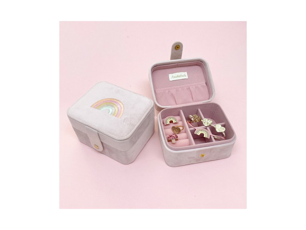 Semišová měkká šperkovnice s vyšívanou duhou k uložení malých pokladů a šperků, která potěší každou parádnici.